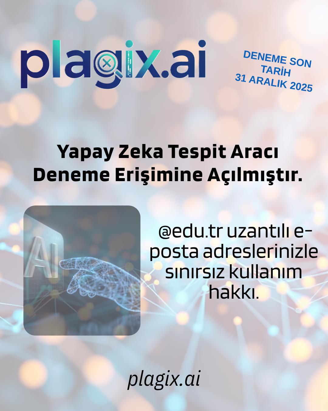 Plagix.ai Yapay Zeka İçerikleri Tespit Aracı 31.12.2025 tarihine kadar deneme erişimine açılmıştır.